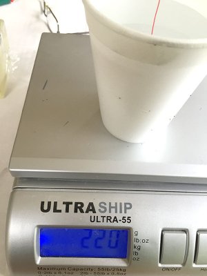 Our lens is actually 16.7 grams, although the scale doesn’t have the tenth’s digit. The cup of water is 206 grams, and the cup of water with the lens dunked is 220 grams, a 14 gram difference.