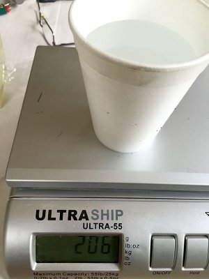 Our lens is actually 16.7 grams, although the scale doesn’t have the tenth’s digit. The cup of water is 206 grams, and the cup of water with the lens dunked is 220 grams, a 14 gram difference.