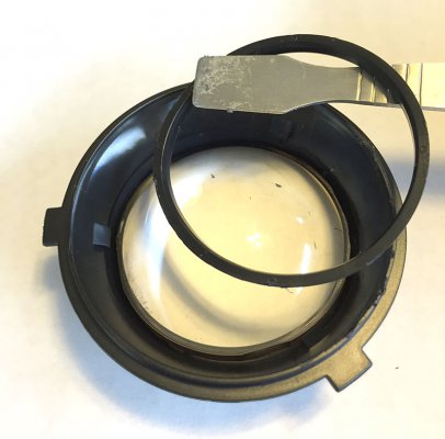 Thus the specific gravity of the lens is 16.7 divided by 14 which is 1.19. Looks like we’ve got acrylic, but the specific gravity is only about 2% off that of polycarbonate, which would be 1.21.